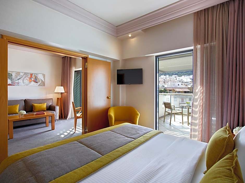 Located on the 6th floor, this junior suite opens to terrace with sun loungers and views over Lycabettus Hill. It includes a bedroom with a king size bed and a living room.